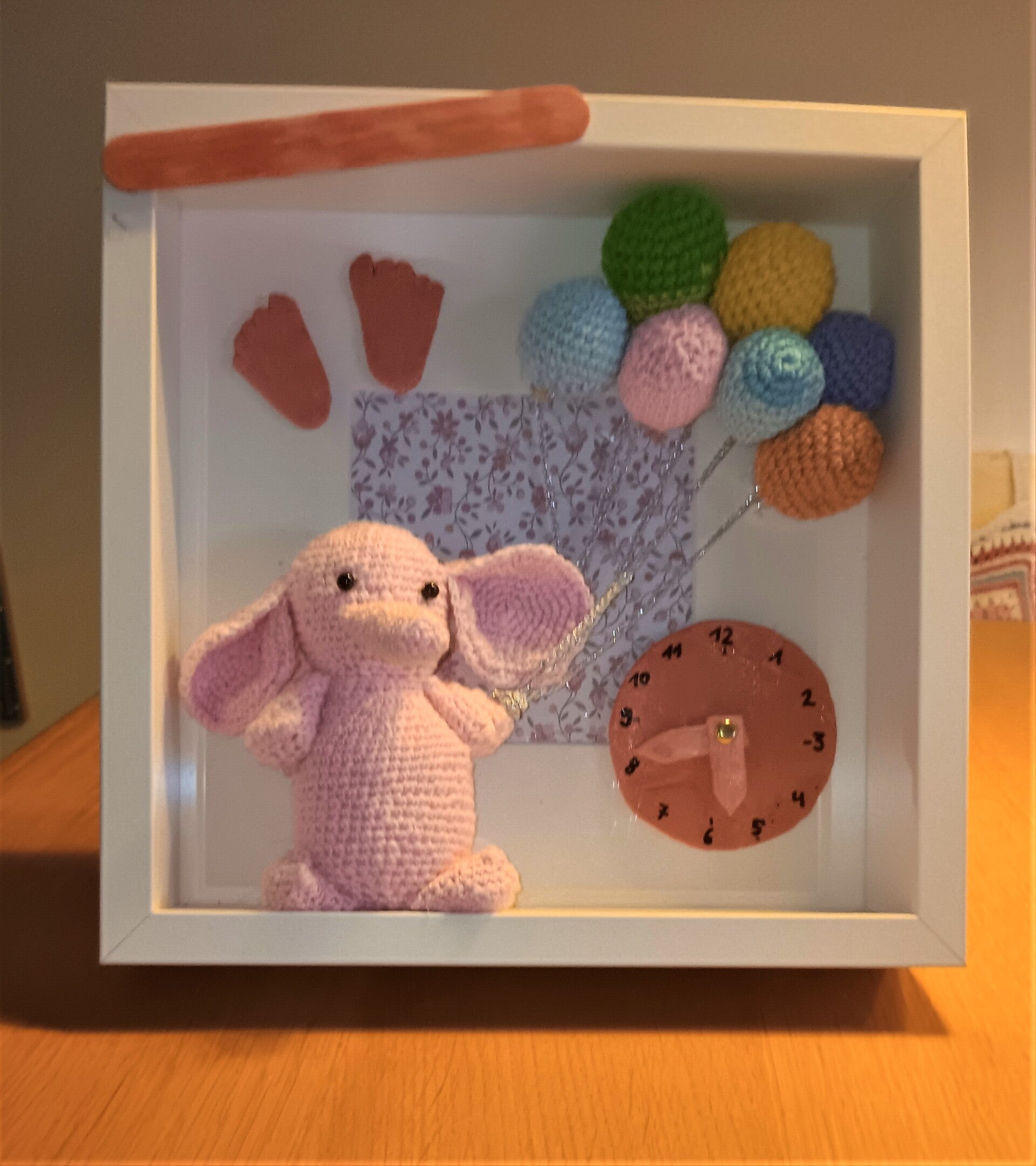 In einem Rahmen ist ein kleiner Elefant mit Luftballons - eine Uhr und Füßchen. In die Uhr wird die Uhrzeit der Geburt eingestellt und auf die Füßchen kommt das Gewicht und die Größe des Neugeborenen. Das Bild kann aufgehängt oder aufgestellt werden. Eine wunderschönes Geschenk für die Babyparty!