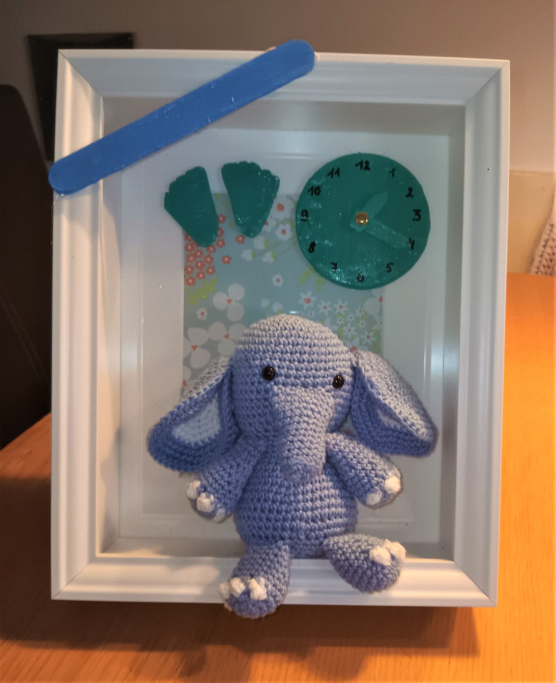 In einem Rahmen ist ein kleiner Elefant - eine Uhr und Füßchen. In die Uhr wird die Uhrzeit der Geburt eingestellt und auf die Füßchen kommt das Gewicht und die Größe des Neugeborenen. Das Schild auf dem Rahmen ist für den Namen vorgesehen. Das Bild kann aufgehängt oder aufgestellt werden. Eine wunderschönes Geschenk für die Babyparty!