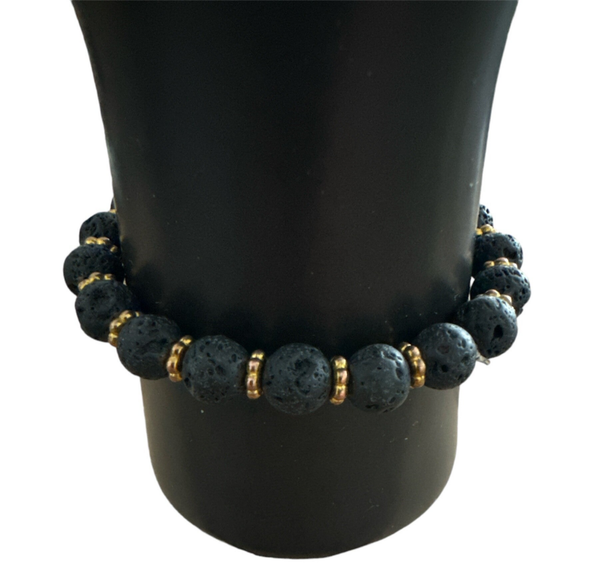 Das Armband besteht aus Schwarz Kunstperlen und dazwischen sind kleine goldene Perlen