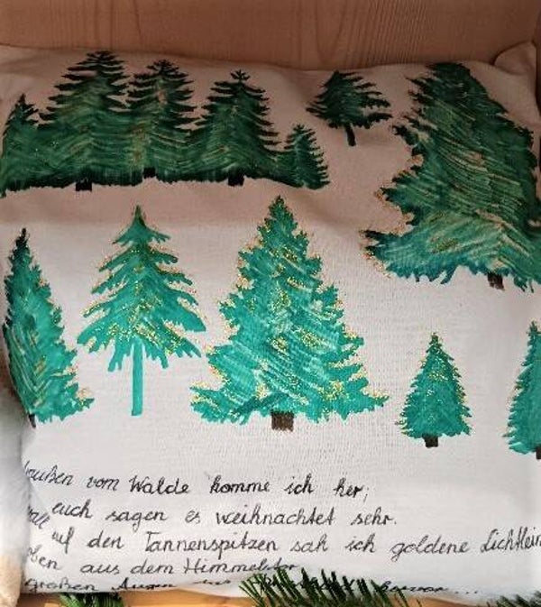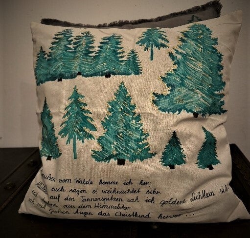 Ein sehr weihnachtliches Kissen. Auf der Vorderseite sind Tannen und ein Auszug von dem Gedicht: Draußen vom Walde komme ich her...von Theodor Storm . Auf der Rückseite ist eine große Glitzertanne.