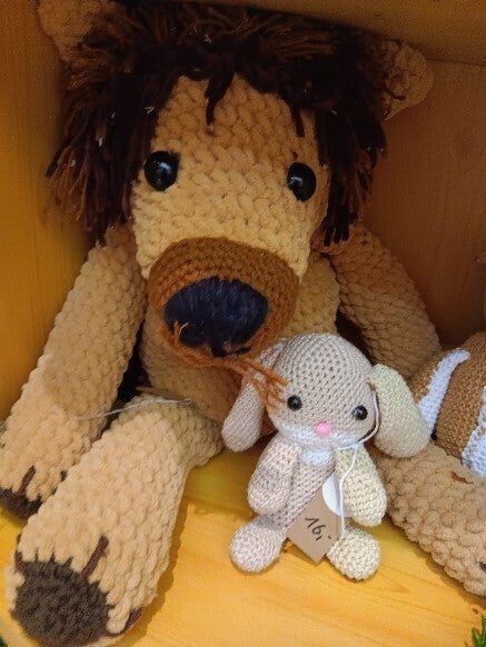 Der Löwe ist mit Chenillwolle gehäkelt, dadurch ist er ganz weich und kuschelig.